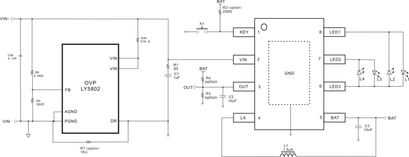 | LY6399N | 30V | 0.2A-0.5A | 0.3A | 4.5uA | 4.2V/4.35V | VBAT/2V/5V | 1/2/3/4 | √ | √ | √ | QFN16 |